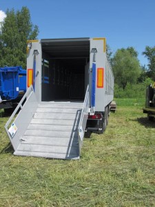 | Особенности комплектации автомобиля | Расчетная вместимость: крупный рогатый скот –до 26 голов -весом до 550 кг., до 33 голов - 450 кг.,до 54 голов - 220 кг. , свиньи –фактически – до 80 голов. Грузоподъемность – 22 000 кг., собственный вес – 8 000 кг., длина 13,6 м. Шасси – двухосное, односкатное, пневмоподвеска, ЕBS «Нaldex», «Wabco» Кузов – собран из металлических оцинкованных стоек с поперечинами на крыше. Снаружи облицован алюминиевыми листами, два ряда вентиляционных окон на боковых стенках, закрываемых металлическими заслонками (новая усиленная конструкция). На крыше – ламинированная фанера 9 мм, покрытая листом алюминия. Задний проем: откидной дверь-трап, со складными бортиками, позволяет легко производить погрузку-выгрузку. Внутри – три перегородки. Пол – рифленый металлический лист с тремя продольными профилями от проскальзывания копыт, покрытие – герметичное полимерное покрытие. Дополнительно устанавливаемое оборудование – поилки (для свиней или для КРС – 6шт), вентиляторы, освещение трапа и кузова (2 прожектора). Боковая аварийная дверь-трап. Высота ССУ – 1200 мм. |